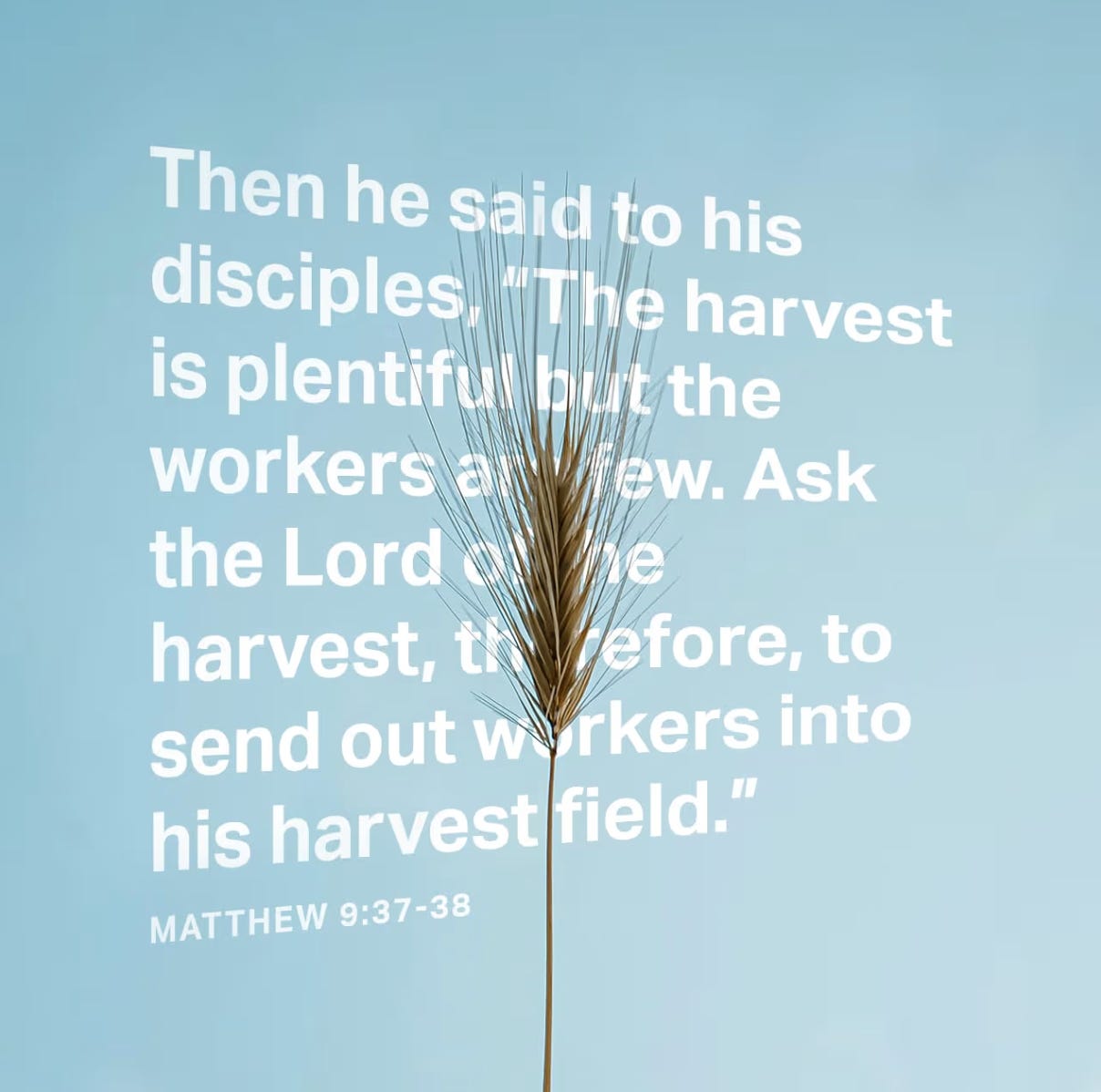 37 Then he said to his disciples, “The harvest is plentiful but the workers are few. 38 Ask the Lord of the harvest, therefore, to send out workers into his harvest field.” - Matthew 9:37-38 NIV
