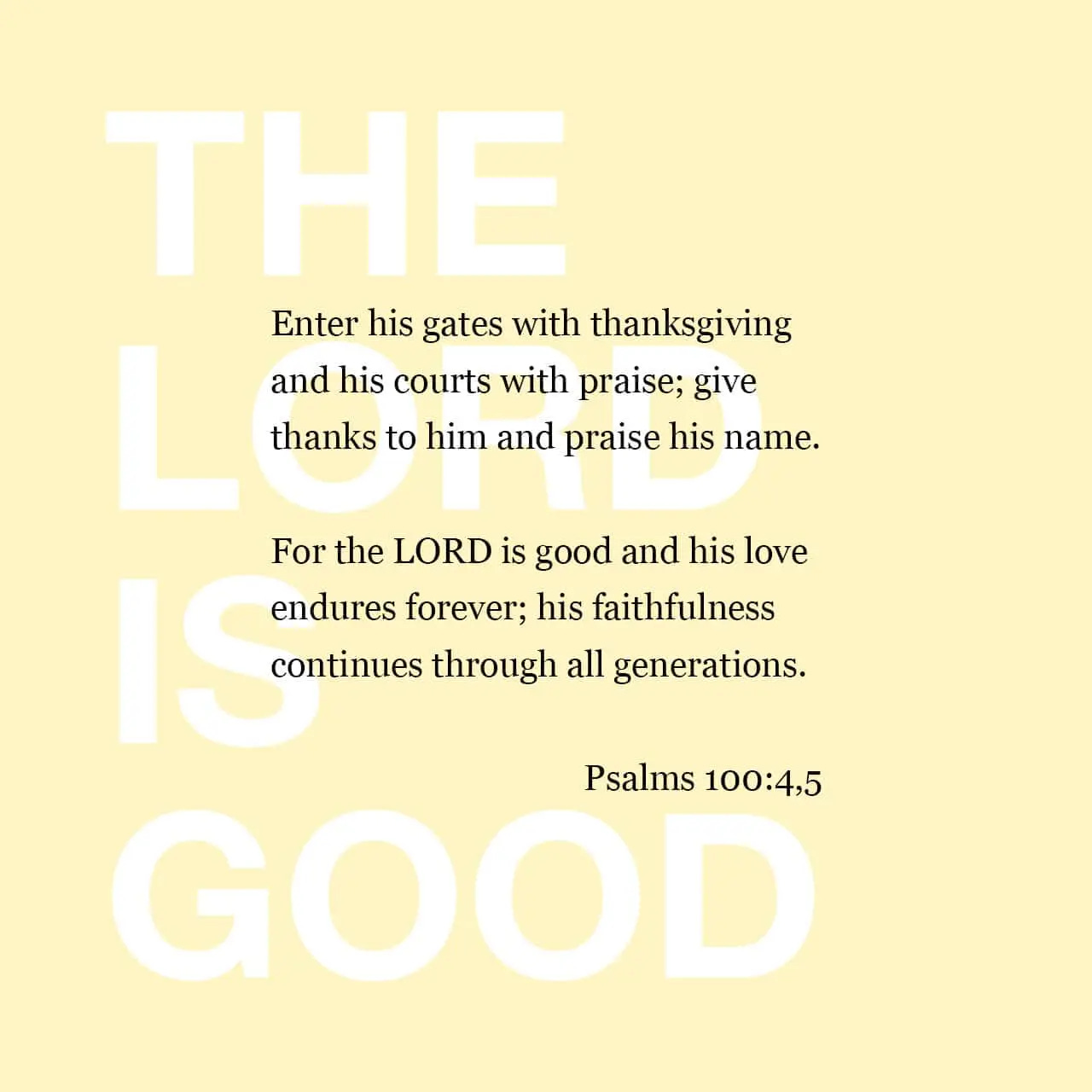 Enter his gates with thanksgiving and his courts with praise; give thanks to him and praise his name. For the LORD is good and his love endures forever; his faithfulness continues through all generations. - Psalms 100:4-5 NIV