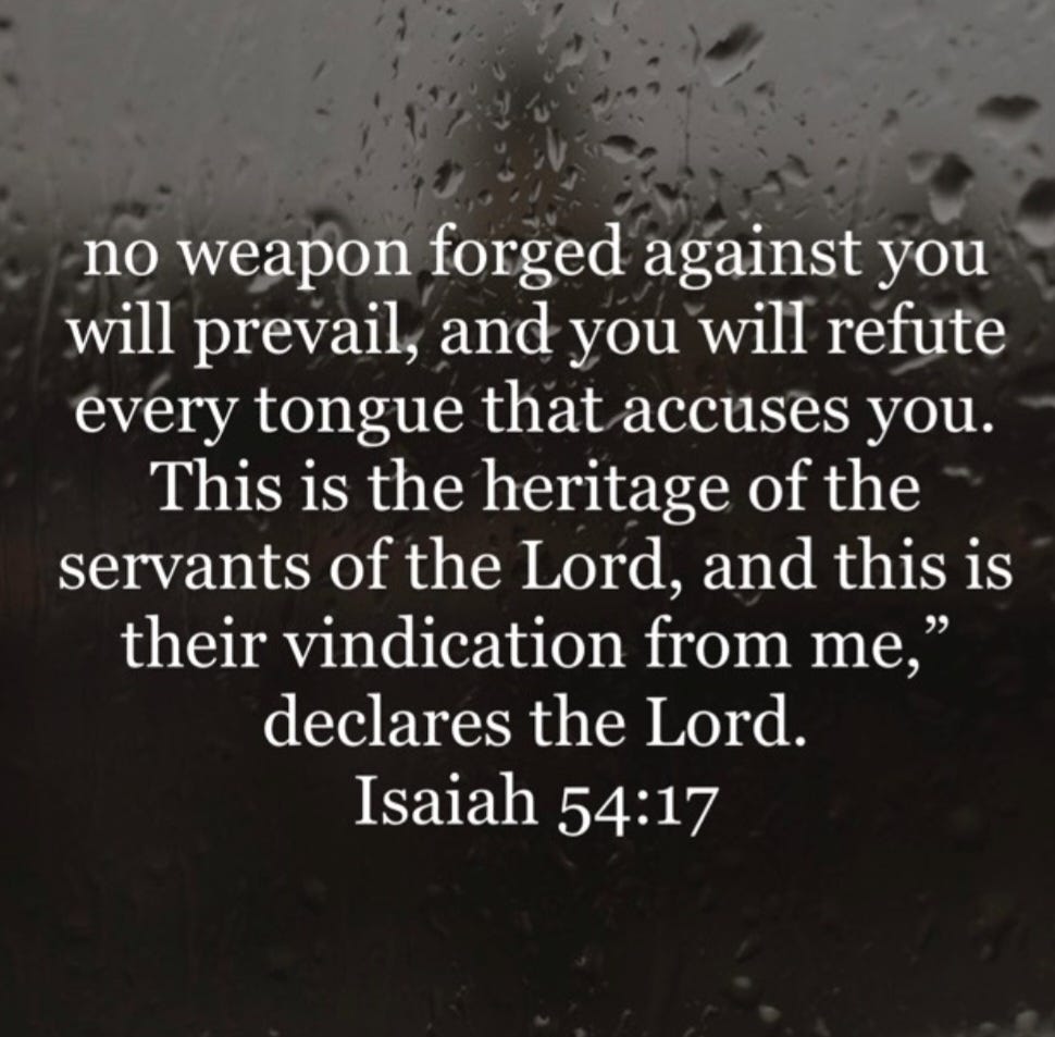 In this scripture, Isaiah is relaying the promise of divine protection from the Lord. The scripture states that this would be our vindication from Him. It is a gift that the Lord covers you. It is a gift that no matter what weapon forms, it will not prevail against you.