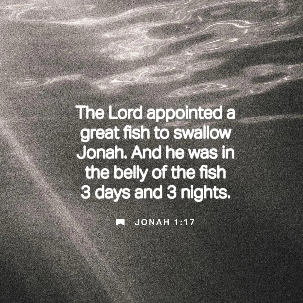 “Now the Lord provided a huge fish to swallow Jonah, and Jonah was in the belly of the fish three days and three nights.”