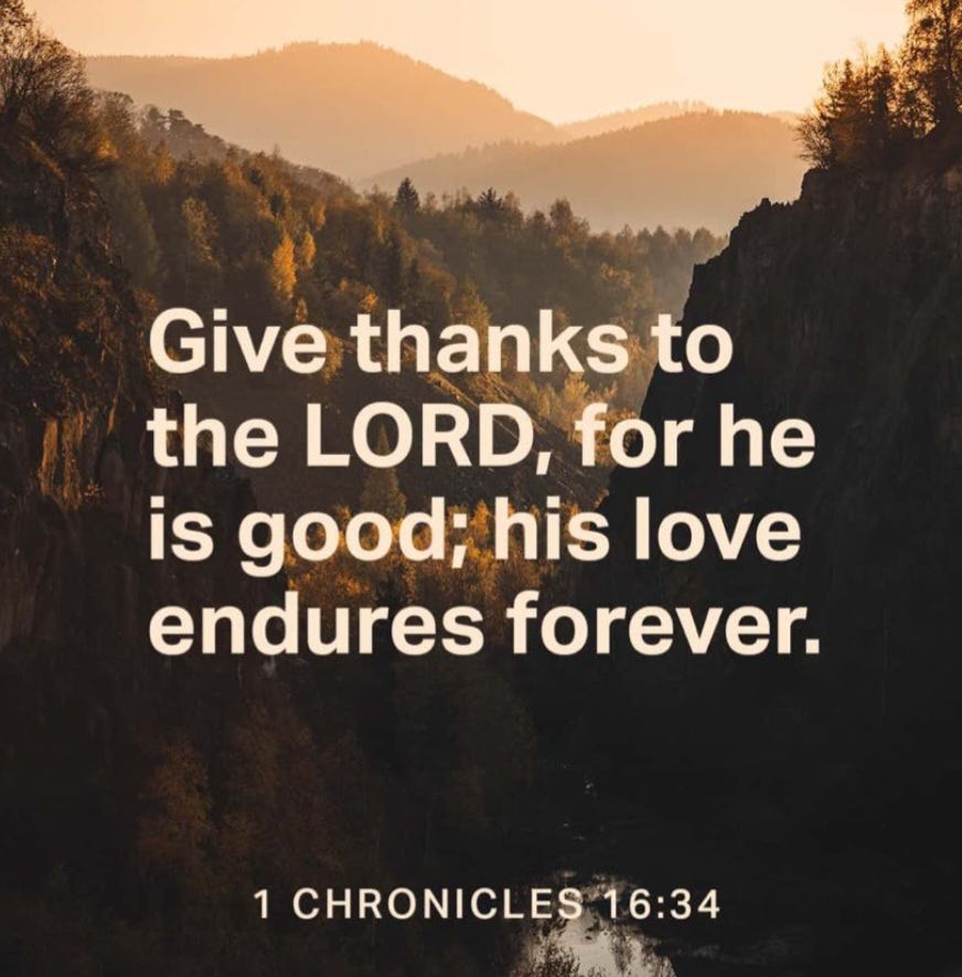 "Give thanks to the Lord, for he is good; his love endures forever." — 1 Chronicles 16:34 (NIV)