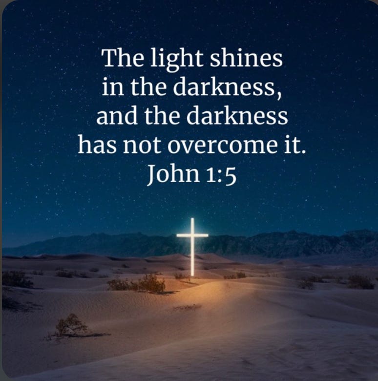 "The light shines in the darkness, and the darkness has not overcome it." — John 1:5 (NIV)
