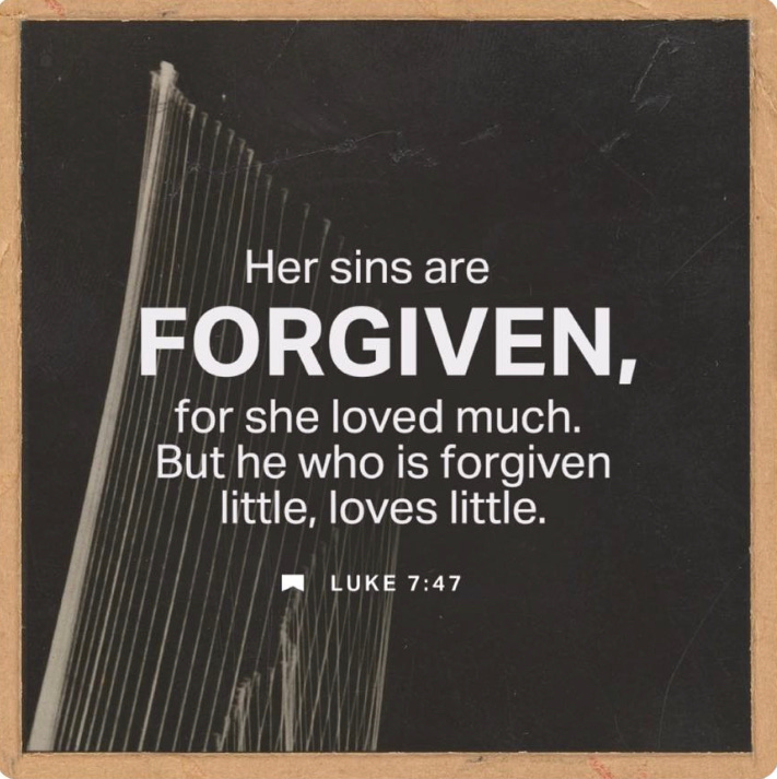 Luke 7:47 (NIV): "Therefore, I tell you, her many sins have been forgiven—as her great love has shown. But whoever has been forgiven little loves little."