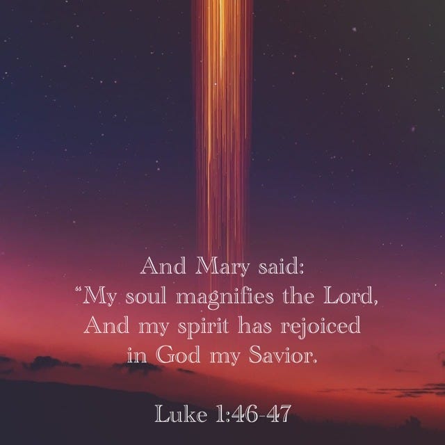 "And Mary said: 'My soul glorifies the Lord and my spirit rejoices in God my Savior.'"