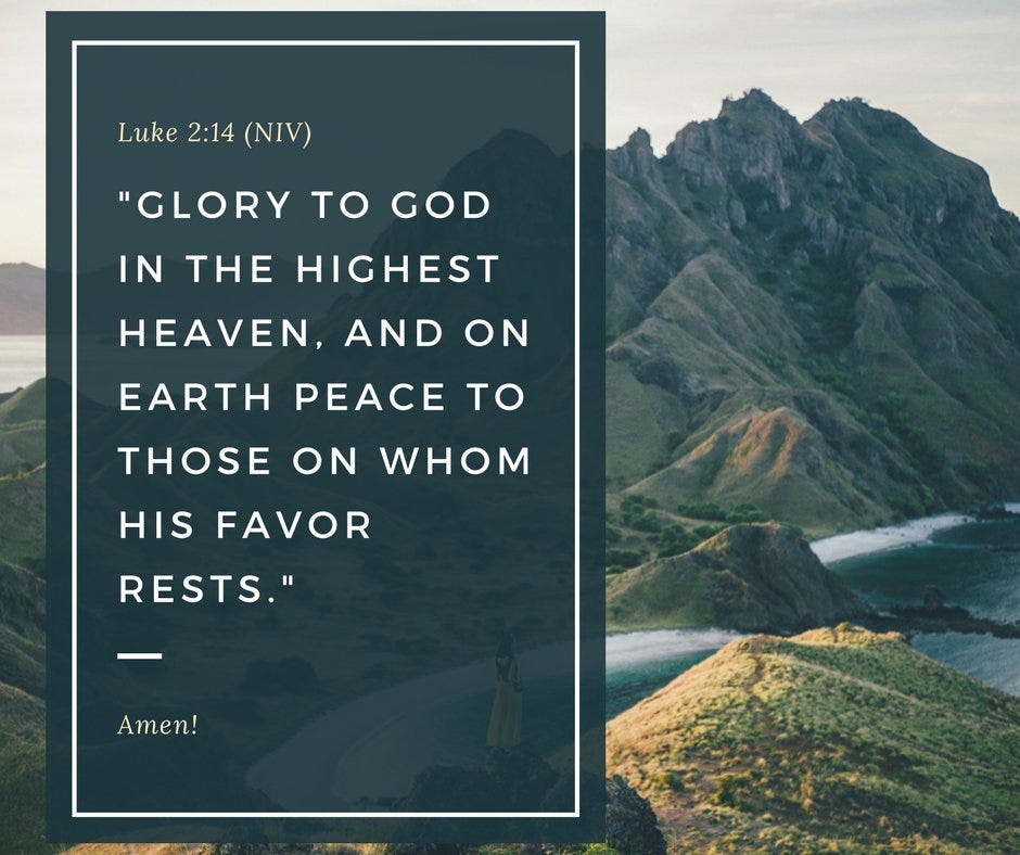 Luke 2:14 (NIV): "Glory to God in the highest heaven, and on earth peace to those on whom his favor rests."