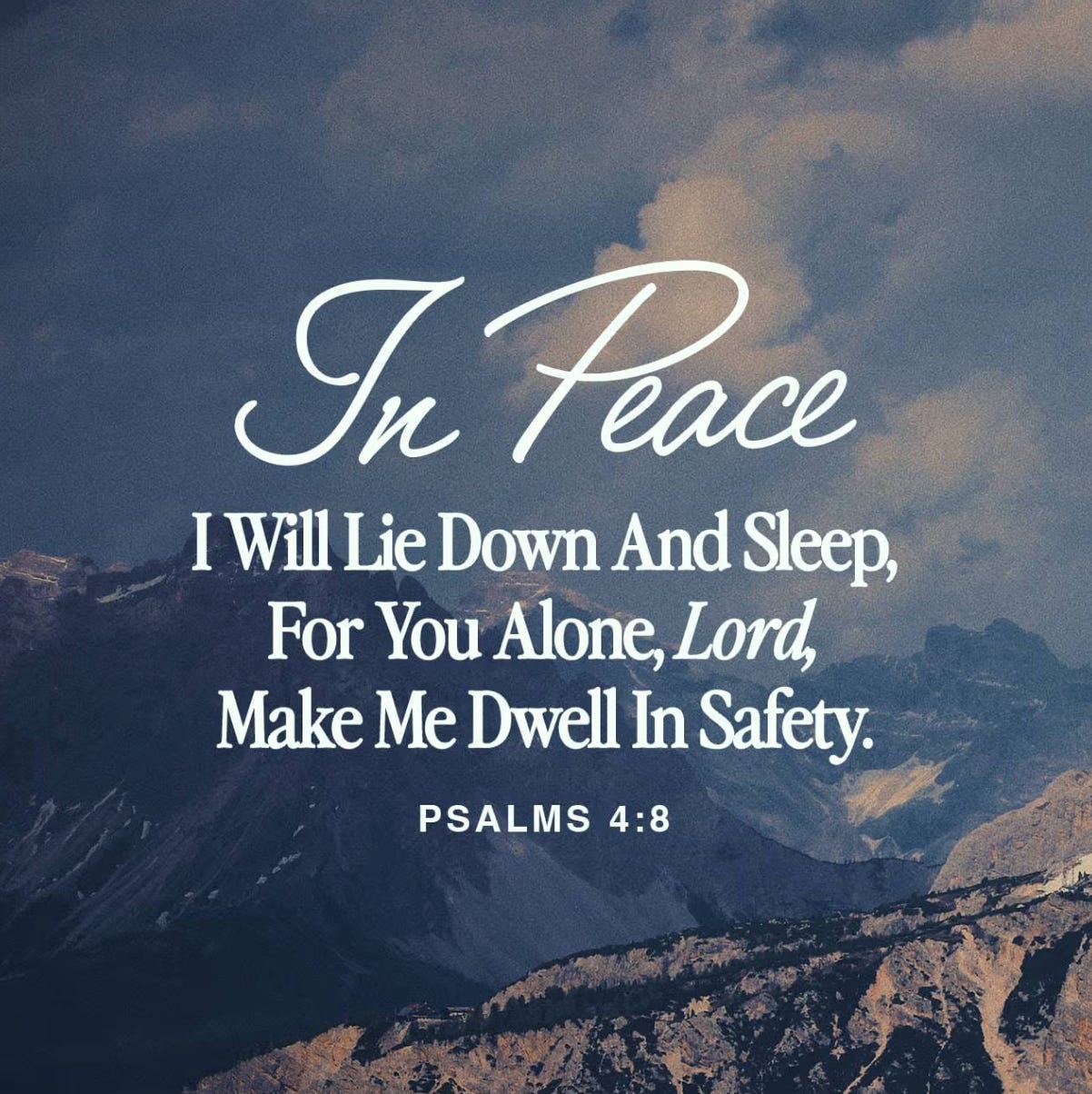 In peace I will lie down and sleep, for you alone, LORD, make me dwell in safety. - Psalm 4:8 NIV