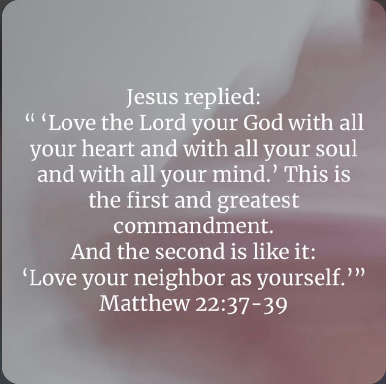 "Jesus replied: ‘Love the Lord your God with all your heart and with all your soul and with all your mind.’ This is the first and greatest commandment. And the second is like it: ‘Love your neighbor as yourself.’" — Matthew 22:37-39 (NIV)