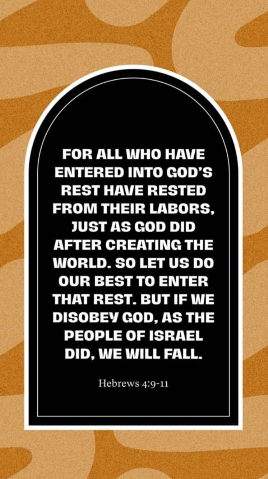 Hebrews 4:9-11 (NIV) says, “There remains, then, a Sabbath-rest for the people of God; for anyone who enters God’s rest also rests from their works, just as God did from his. Let us, therefore, make every effort to enter that rest, so that no one will perish by following their example of disobedience.”