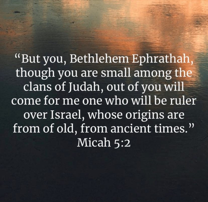 "But you, Bethlehem Ephrathah, though you are small among the clans of Judah, out of you will come for me one who will be ruler over Israel, whose origins are from of old, from ancient times." — Micah 5:2 (NIV)