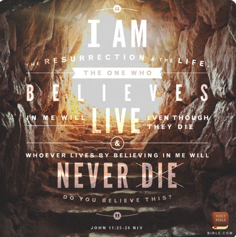 "Jesus said to her, ‘I am the resurrection and the life. The one who believes in me will live, even though they die; and whoever lives by believing in me will never die. Do you believe this?’" — John 11:25-26 (NIV)