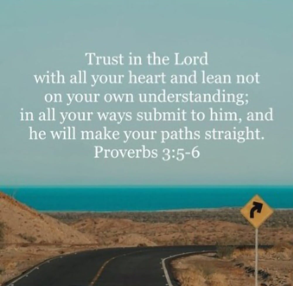 Trust in the Lord with all your heart and lean not on your own understanding; in all your ways submit to him, and he will make your paths straight. - Proverbs 3:5-6 NIV