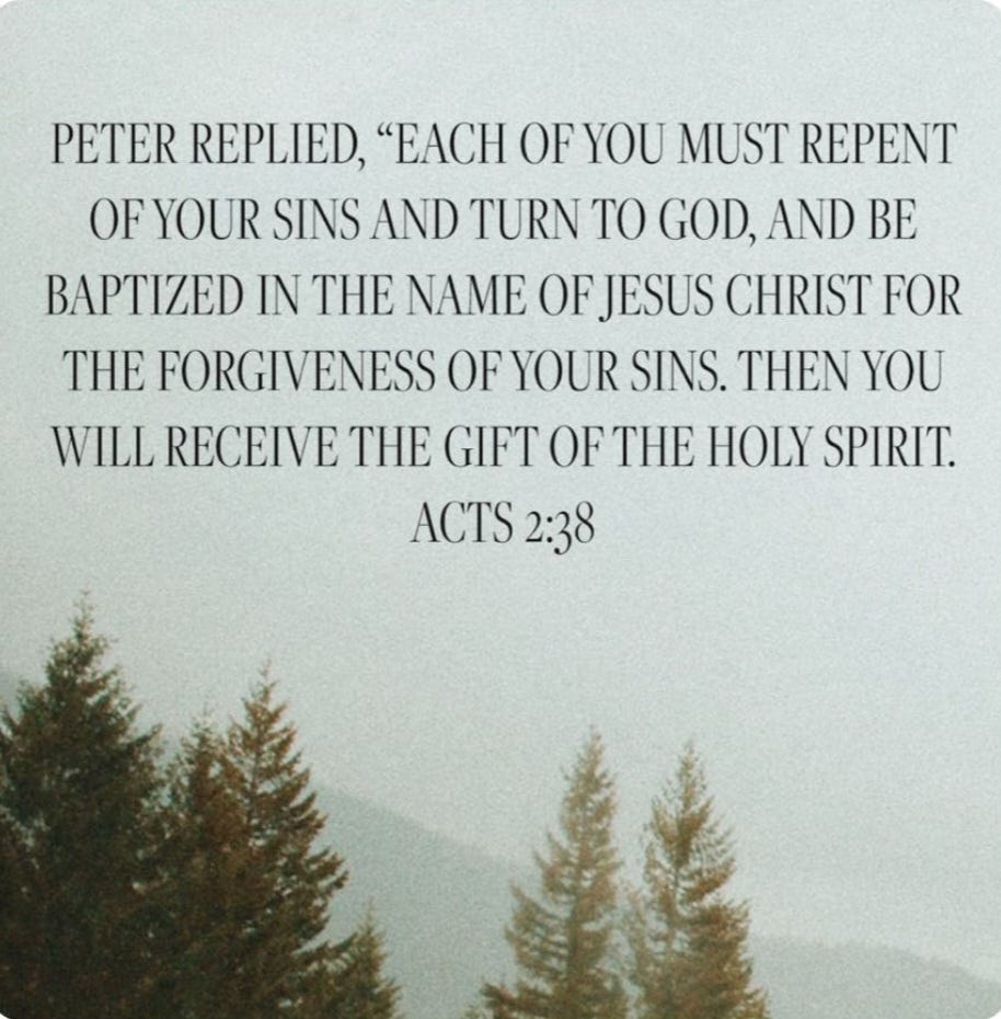 Acts 2:38 (NIV): "Peter replied, 'Repent and be baptized, every one of you, in the name of Jesus Christ for the forgiveness of your sins. And you will receive the gift of the Holy Spirit.'"
